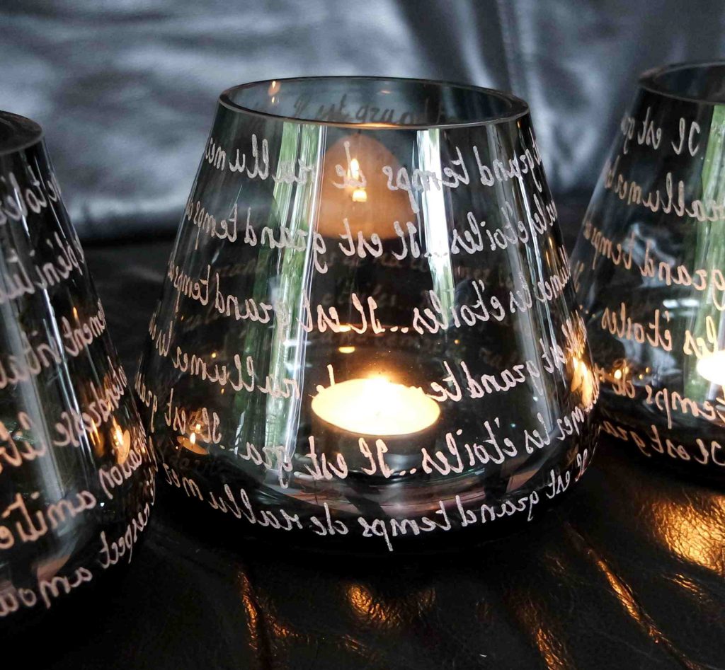 Depuis décembre 2008, je grave en écriture miroir des objets en verre tels que photophores, lanternes, chandeliers, vases, lampes…Lors de l’exposition « Etnik’Art » à la Grand’Poste de Liège, j’ai eu l’idée, pour réchauffer l’atmosphère, de graver des photophores en écrivant de droite à gauche. Grâce à la transparence du verre, les visiteurs pouvaient enfin lire mes messages. Ce fut un succès. Non seulement ils savaient lire le texte par l’intérieur mais en plus, avec la lumière, l’écriture se reflétait à l’endroit sur le mur ou sur le sol.
